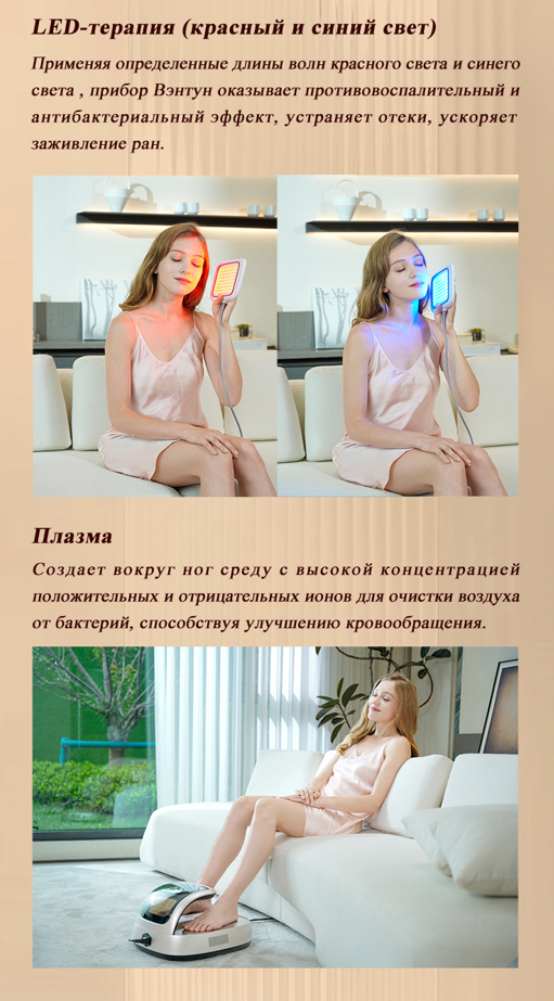 Это компактный и понятный в использовании прибор для домашнего ухода, который сочетает дальнее инфракрасное тепло, LED‑свет красного (633 нм) и синего (415 нм) диапазонов, а также ионизацию воздуха и прогревающий гель. Прибор Вэнтун WHIEDA подойдёт тем, кто хочет мягко поддержать микроциркуляцию, восстановление мышц и качество кожи в удобном формате без визитов в салон. Главная ценность — комплексное воздействие: от термотерапии стоп и пояса до световой поддержки кожи.