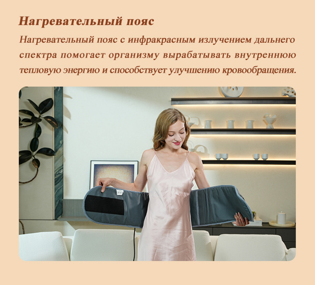 - Прогревающий пояс — направленный FIR‑нагрев для расслабления мышц поясницы и живота.